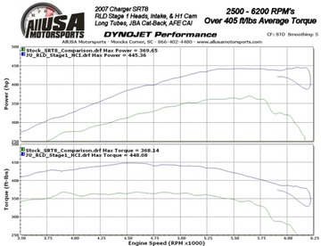 Late Model SRT8 6.1 (370 cubic inch) Hemi with RLD Performance upper end kit. RLD Performance Stage 3 CNC Intake Manifold, RLD Performance "Flowline Machined" Racing Cylinder Heads, factory valves, .650 lift PSI conical springs, , RLD-H1 Custom Roller Camshaft, RLD Upgrade Pushrods, 50lb injectors. Stock accessory drive, stock throttle body, stock rocker arm system and stock exhaust manifolds. 445HP/448T. 405ft/lbs average torque. Idles at 750 rpm. Idle at right. Engine Dyno Sheet for this 6.1 Hemi package is below. Note the high Volumetric Efficiency! Video at right.